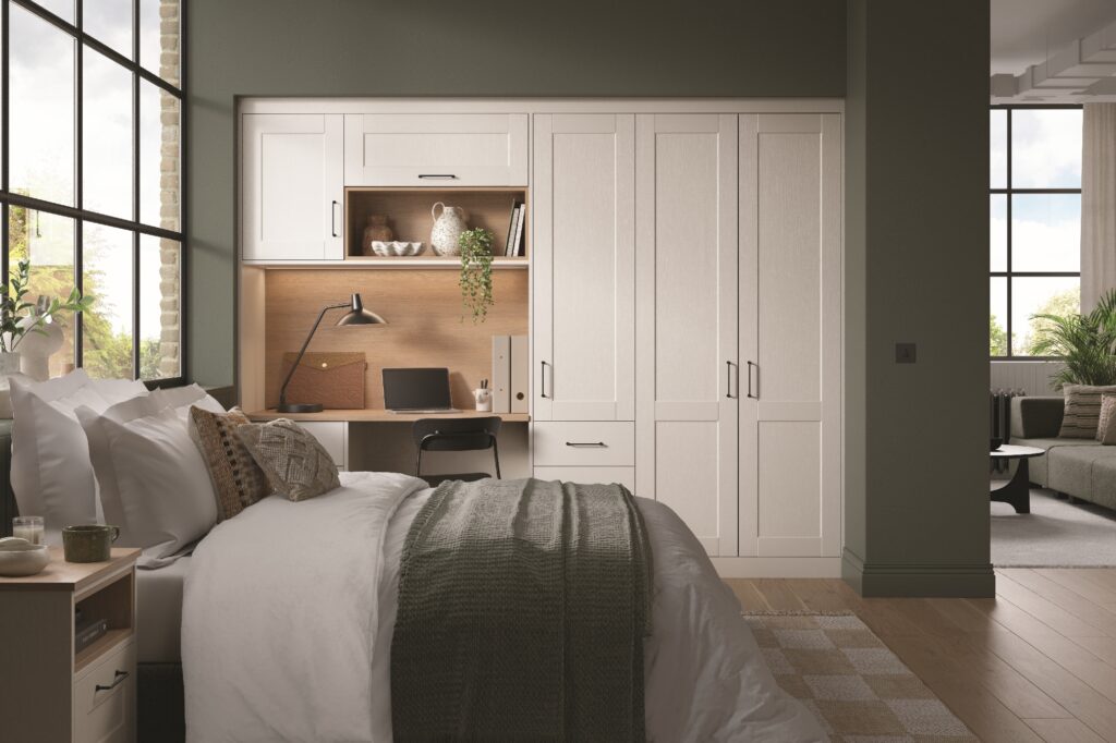 With its v-groove shaker design, woodgrain effect foil finish, and selection of on-trend colours, Kensington is ideal for these seeking a stylish, yet durable bespoke fitted bedroom wardrobes that can withstand the busy demands of everyday living.